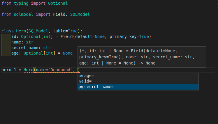 SQLModel even adopts currently in development standards for Python type annotations to ensure the best developer experience, so you will get inline errors and autocompletion even while creating new model instances.