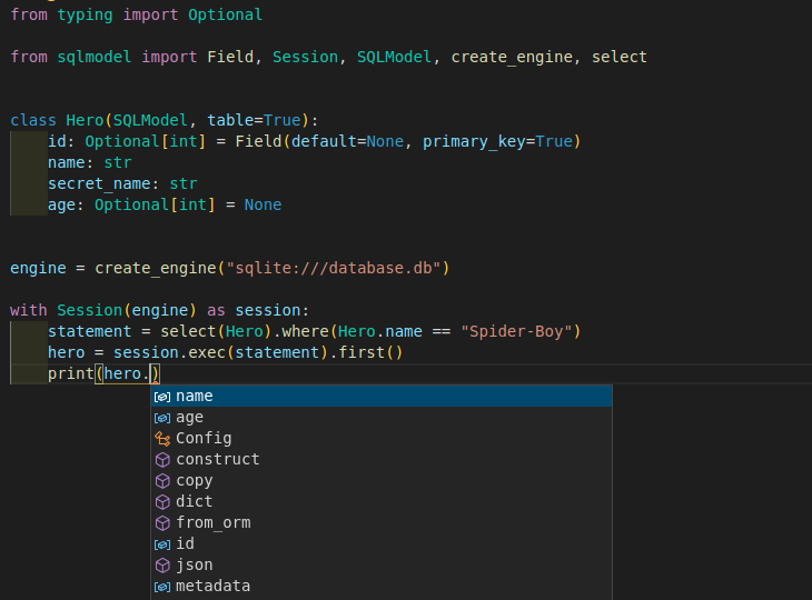 You won't need to keep guessing the types of different attributes in your models, if they could be None, etc. Your editor will be able to help you with everything because SQLModel is based on standard Python type annotations.